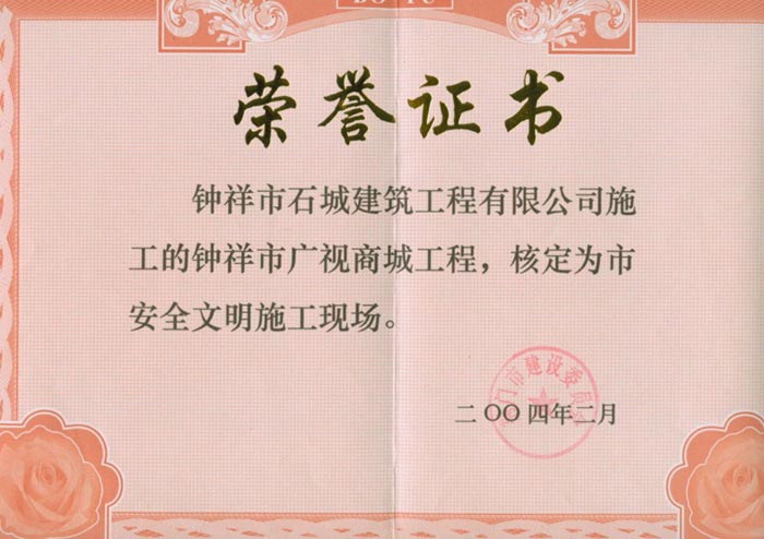 2004年評為鐘祥市安全文明施工現(xiàn)場(廣視商城)