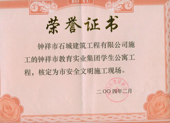2004年被評為鐘祥市安全文明施工現(xiàn)場(教育實業(yè))
