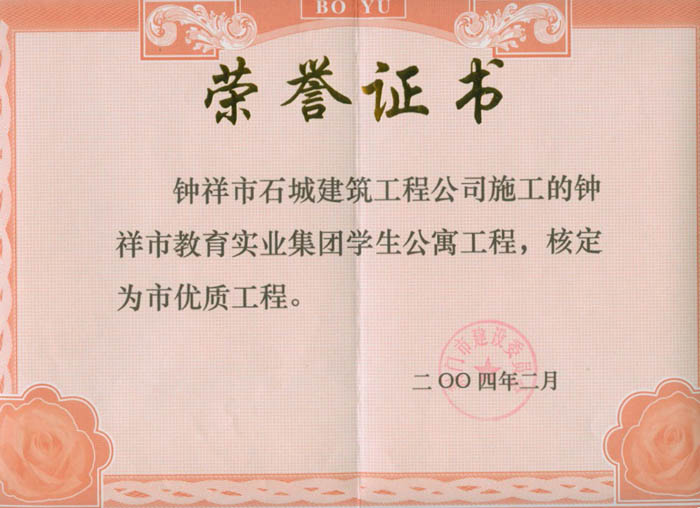 2004年被評為鐘祥市優(yōu)質(zhì)工程(教育實業(yè))