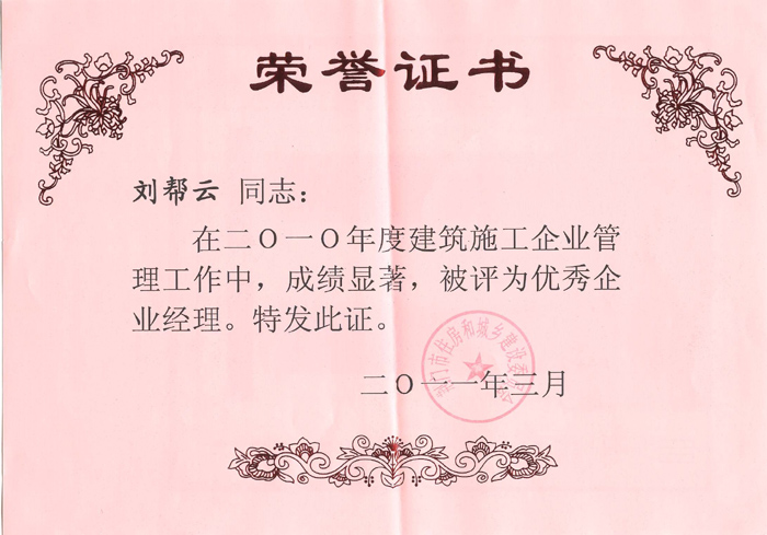 2011年3月劉幫云同志被評(píng)為優(yōu)秀企業(yè)經(jīng)理