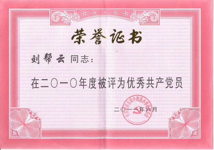 2011年6月劉幫云同志在2010年度被評(píng)為優(yōu)秀共產(chǎn)黨員
