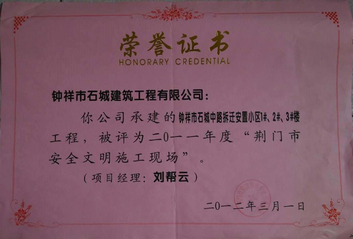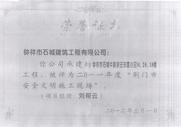2012年3月被評(píng)為2011年度“荊門市安全文明施工現(xiàn)場(chǎng)”