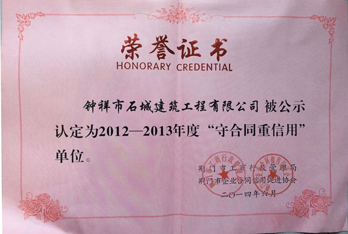 2014年6月被公示認(rèn)定為2012-2013年度“守合同重信用”單位