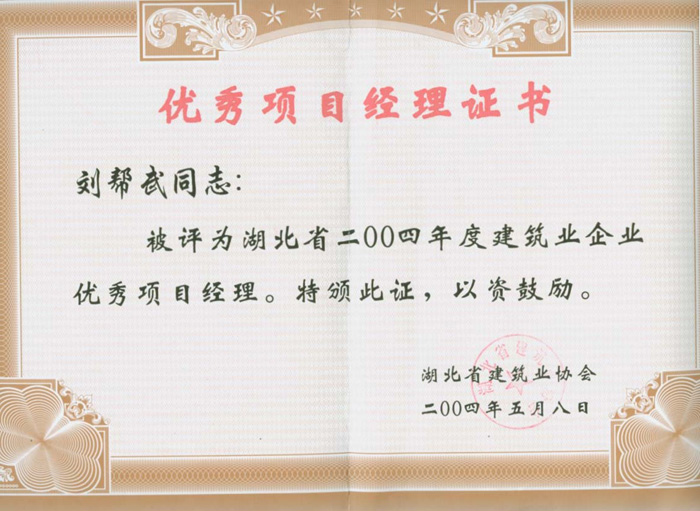 2004年5月劉幫武同志被評為湖北省2004年度建筑業(yè)企業(yè)優(yōu)秀項目經(jīng)理