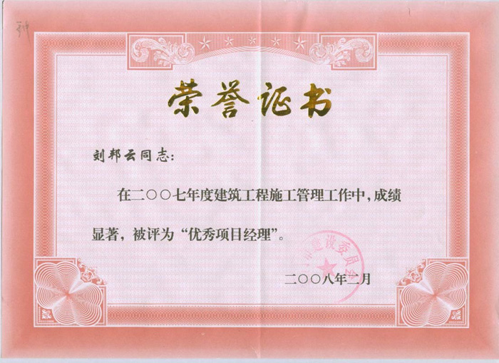 2008年2月劉幫云同志在2007年度被評為“優(yōu)秀項目經(jīng)理”