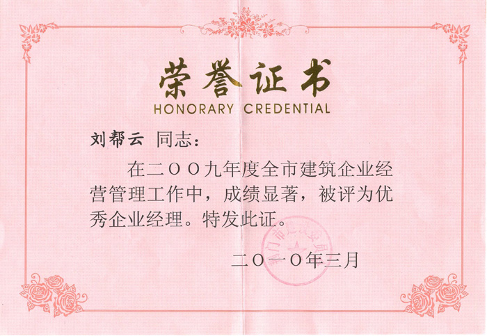 2010年3月劉幫云在2009年度被評為優(yōu)秀企業(yè)經(jīng)理