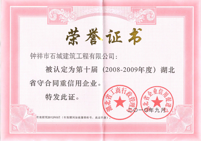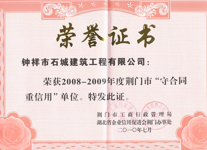2007年7月榮獲2008-2009年度荊門市“守合同重信用”單位