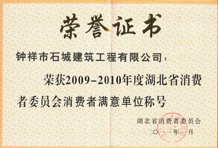 2011年1月榮獲2009-2010年度湖北省消費委員會消費者滿意單位稱號